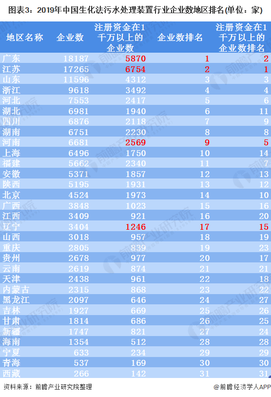 值得注意的是,排名第一的廣東省共有18187家新成立企業(yè),但是它的注冊資金在1千萬以上的企業(yè)數(shù)(5870家)卻不如排名第二的江蘇省(6754家)。因此,可以看出雖然廣東省有18187家企業(yè)但是江蘇省(17265家)才是中國生化法污水處理裝置行業(yè)主要集中地。此外,河南省和遼寧省也是同樣的情況,雖然企業(yè)數(shù)排名較后,但是其注冊資金在1千萬以上的企業(yè)數(shù)排名卻比新成立企業(yè)數(shù)排名較為靠前。