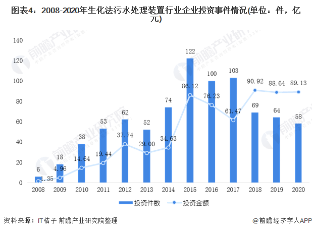 根據(jù)it桔子的數(shù)據(jù)顯示,2008-2020年生化法污水處理裝置行業(yè)企業(yè)投資事件呈現(xiàn)波動趨勢。在2015年,生化法污水處理裝置行業(yè)企業(yè)投資事件達到近年來峰值122件,但投資金額為86.12億元。從投資金額角度來看,在2018年,生化法污水處理裝置行業(yè)企業(yè)投資達到了近年來峰值90.92億元。