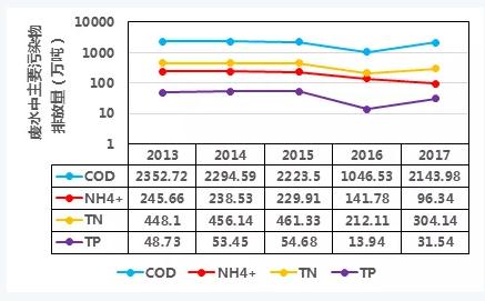 根據(jù)2013-2017年《中國(guó)統(tǒng)計(jì)年鑒》,我國(guó)廢水排放總量保持在700億噸,其中廢水中cod、氨氮(nh4+)、總氮(tn)、tp排放量如下圖,可見2015年國(guó)務(wù)院發(fā)布了《水污染防治行動(dòng)計(jì)劃》(簡(jiǎn)稱“水十條”)后,這幾種污染物排放量得到了削減。