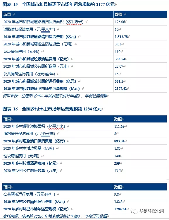 根據(jù)2020年中國(guó)城鄉(xiāng)建設(shè)統(tǒng)計(jì)年鑒,全國(guó)城市和縣城道路清掃保潔面積將達(dá)126.06億平方米,生活垃圾清運(yùn)量約3.03億噸,公共廁所數(shù)量將達(dá)22.07萬(wàn)座。將經(jīng)典環(huán)衛(wèi)項(xiàng)目的費(fèi)用代入數(shù)據(jù)中,我們測(cè)算出全國(guó)城市和縣城環(huán)衛(wèi)市場(chǎng)年運(yùn)營(yíng)規(guī)模約為2177.42億元。全國(guó)鄉(xiāng)村道路清掃保潔面積將達(dá)91.24億平方米,生活垃圾清運(yùn)量約1.85億噸,公共廁所數(shù)量將達(dá)12.95萬(wàn)座。同樣將以前經(jīng)典環(huán)衛(wèi)項(xiàng)目的費(fèi)用代入數(shù)據(jù)中,我們測(cè)算出全國(guó)鄉(xiāng)村環(huán)衛(wèi)市場(chǎng)年運(yùn)營(yíng)規(guī)模約為1284.34億元。加上此次垃圾分類帶來(lái)的空間提升,當(dāng)前環(huán)衛(wèi)市場(chǎng)規(guī)模約為3800億。
