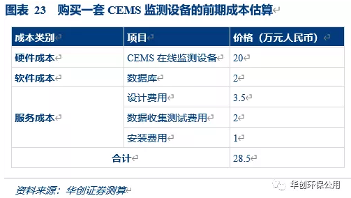 根據(jù)環(huán)保在線網(wǎng)站的統(tǒng)計(jì),國(guó)內(nèi)大部分公司對(duì)cems監(jiān)測(cè)系統(tǒng)的公開(kāi)報(bào)價(jià)均在10-20萬(wàn)人民幣之間,使用壽命為10年。不包括服務(wù)費(fèi)??紤]到大部分監(jiān)測(cè)系統(tǒng)目前只能監(jiān)測(cè)so2、nox、顆粒物,并未安裝具有二氧化碳監(jiān)測(cè)功能的部件,我們將20萬(wàn)元作為具備監(jiān)測(cè)二氧化碳功能的cems監(jiān)測(cè)系統(tǒng)的平均價(jià)格。軟件成本和服務(wù)成本我們參考了美國(guó)市場(chǎng)的價(jià)格,并基于此對(duì)公司持有一套cems在線監(jiān)測(cè)系統(tǒng)的現(xiàn)金流進(jìn)行了測(cè)算: