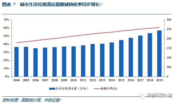 截至2019年,我國(guó)城鎮(zhèn)化率已達(dá)60.6%,提前完成“十三五”規(guī)劃提出的到2020年實(shí)現(xiàn)城鎮(zhèn)化率達(dá)到60%的目標(biāo),預(yù)計(jì)到2025年,中國(guó)城鎮(zhèn)化率有望達(dá)到66.5%。城鎮(zhèn)化率提升推動(dòng)居民生活水平的提高,進(jìn)而消費(fèi)水平提升將從源頭帶來(lái)穩(wěn)步增長(zhǎng)的垃圾清運(yùn)量。2019年我國(guó)城鎮(zhèn)垃圾清運(yùn)量達(dá)到2.4億噸,同比增加6.16%,假設(shè)2020-2025年年均增速6.5%,預(yù)計(jì)到2025年城鎮(zhèn)生活垃圾清運(yùn)量有望達(dá)3.53億噸。
