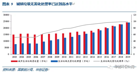 就當(dāng)前而言,我國(guó)城鎮(zhèn)垃圾無(wú)害化處理率超過(guò)99%,絕對(duì)量持續(xù)增長(zhǎng)。2019年我國(guó)城市垃圾清運(yùn)量為2.42億噸,其中生活垃圾無(wú)害化處理量2.4億噸,占比99.2%,同比提升0.3個(gè)百分點(diǎn),目前城市垃圾無(wú)害化處理率已達(dá)到高水平。而生活垃圾無(wú)害化處理量近十年cagr為7.9%,保持高速增長(zhǎng)。
