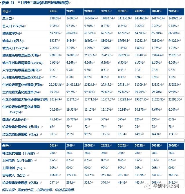 根據(jù)我們的假設(shè),可推算到2022年,生活垃圾無(wú)害化處理量可達(dá)1.7億噸,2025年可達(dá)2.2億噸,以2020年中標(biāo)項(xiàng)目均價(jià)72元/噸和處理單價(jià)0.65元/度的上網(wǎng)電價(jià)計(jì)算,2025年垃圾焚燒處理規(guī)模將達(dá)541億元,市場(chǎng)空間仍大。