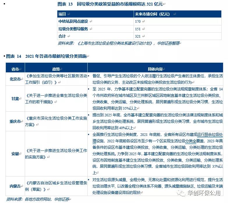 垃圾分類政策頻出,因政策受益的市場(chǎng)規(guī)模約321億。2020年11月,住房和城鄉(xiāng)建設(shè)部等部門印發(fā)《關(guān)于進(jìn)一步推進(jìn)生活垃圾分類工作的若干意見(jiàn)》的通知,明確力爭(zhēng)再用五年左右時(shí)間,在地級(jí)及以上城市因地制宜基本建立生活垃圾分類投放、分類收集、分類運(yùn)輸、分類處理系統(tǒng)。2019年6月,住房和城鄉(xiāng)建設(shè)部等部門出臺(tái)了《關(guān)于在全國(guó)地級(jí)及以上城市全面開(kāi)展生活垃圾分類工作的通知》,明確了“以建立46個(gè)重點(diǎn)城市垃圾分類處理系統(tǒng)為第一步,并逐步實(shí)現(xiàn)全國(guó)地級(jí)及以上城市的生活垃圾分類處理系統(tǒng)的建設(shè)”目標(biāo)。我們認(rèn)為垃圾分類政策的進(jìn)一步推進(jìn)和落實(shí)有望顯著帶動(dòng)垃圾中轉(zhuǎn)站、回收網(wǎng)點(diǎn)和督導(dǎo)、清運(yùn)服務(wù)需求的提升,未來(lái)市場(chǎng)空間約321億元。