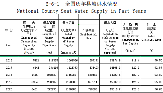 截止2020年末,我國縣城供水普及率96.66%,較“十二五”增6.7%,建成區(qū)供水管道密度11.56公里/平方公里??h城污水處理率達(dá)95.05%,較“十二五”增加9.83%,污水處理廠集中處理率94.42%,集中建成區(qū)排水管道密度9.60公里/平方公里。