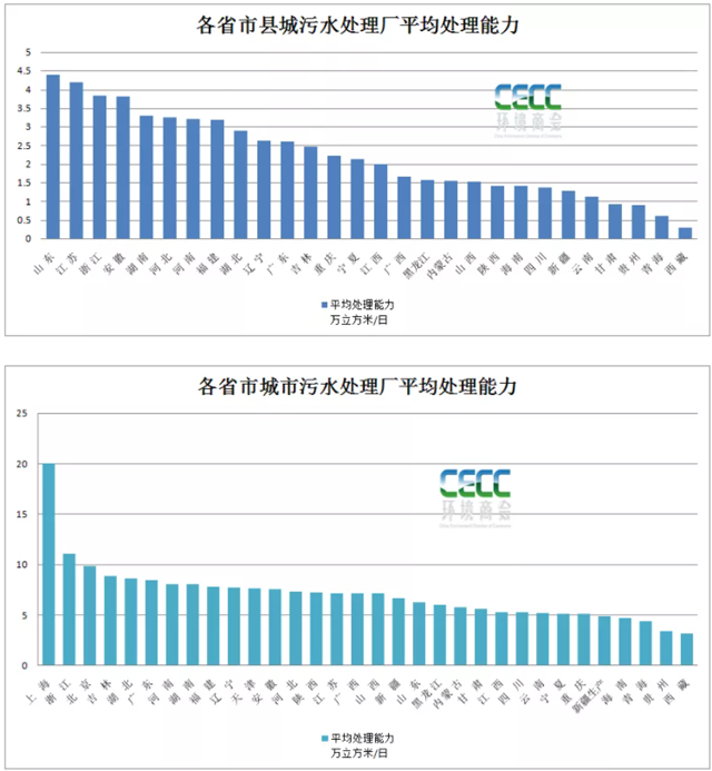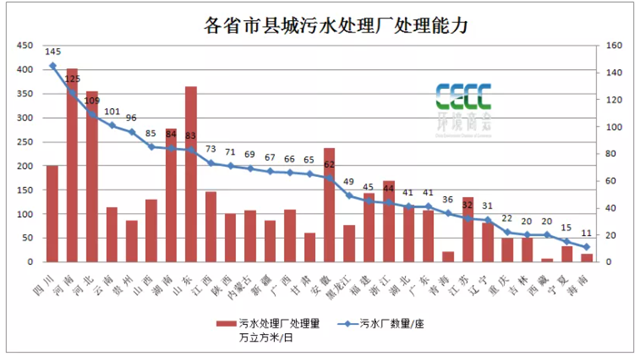 四川、山東、安徽等省市鄉(xiāng)鎮(zhèn)污水處理廠數(shù)量排名靠前,其中四川省最多,達(dá)2211個,處理能力為219萬立方米/日,鄉(xiāng)鎮(zhèn)污水處理裝置處理能力為276萬立方米/日。從污水廠處理能力來看,排行靠前的是廣東、江蘇、山東等地,分別為623萬立方米/日、476萬立方米/日、370萬立方米/日等。