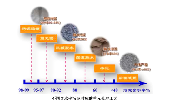 為了實現(xiàn)污泥的減容減量,需要分別根據(jù)不同含水率對應(yīng)的污泥特性選擇相應(yīng)的脫水干化方式和單元處理技術(shù),進而得到不同含水率的污泥產(chǎn)物。常見的單元處理技術(shù)主要包括污泥濃縮、污泥預處理(調(diào)理調(diào)質(zhì))、污泥(深度)機械脫水、污泥(熱)干化等。